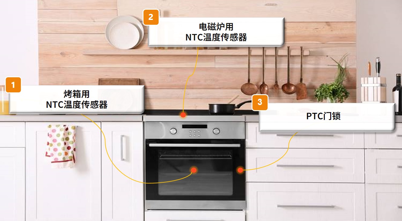 現代電烤箱提供熱對流功能,達成快速均勻的烘烤效果,而多功能烤箱如蒸烤箱、微波烤箱則提供不同烹調方式和溫度設定。為了控制加熱,烤箱內通常須安裝溫度傳感器,偵測熱空氣溫度。適用于烤箱的NTC溫度傳感器,封裝于不銹鋼外殼并使用耐高溫線材,傳感器(頭部)可測量高達300°C的溫度。